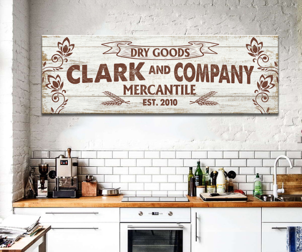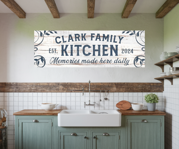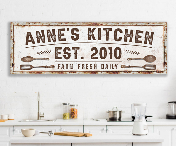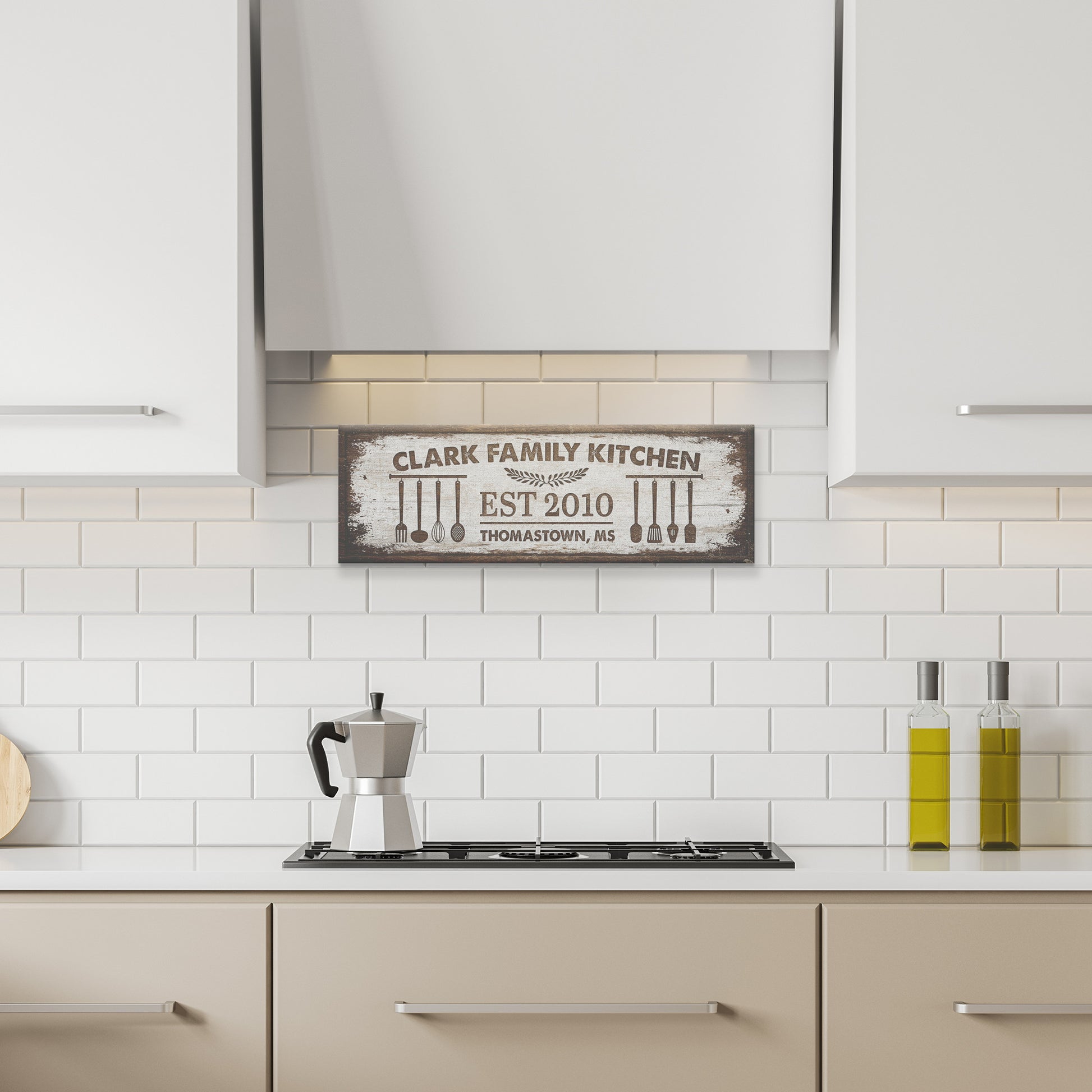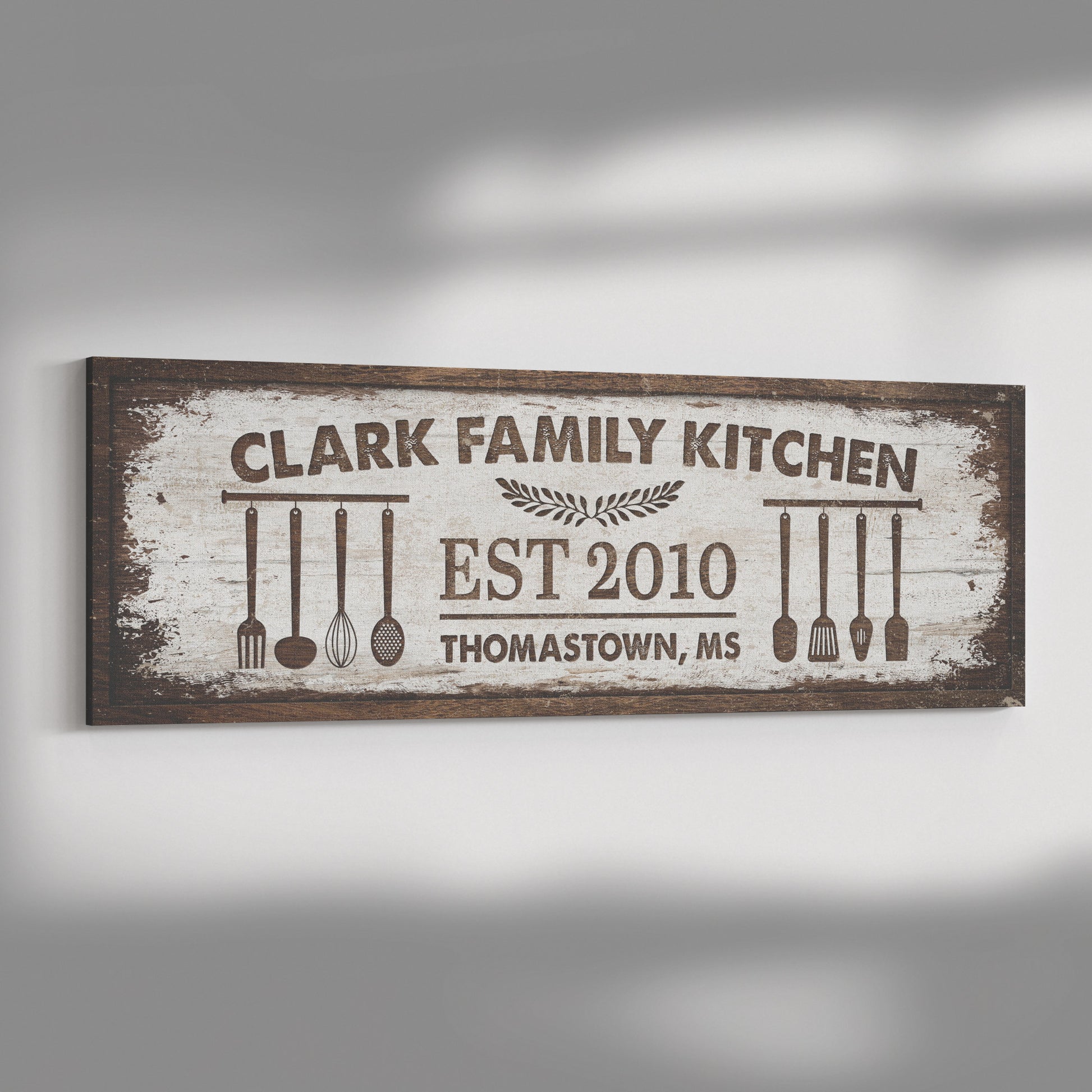 Bring the charm of a farmhouse kitchen to your home with this personalized canvas wall art, featuring a distressed wooden backdrop and your family name, date, and town. The design is completed with touches of antique kitchenware, adding character to the piece. Its timeless look and earthy tones make it a perfect addition to your kitchen or dining area, adding a touch of warmth and personality to your space. With the hanging hardward included, this piece is easy to hang in seconds.